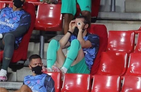 التقطت عدسات الكاميرات بيل على مقاعد البدلاء وهو يضع يديه على عينيه، على شاكلة منظار يستكشف به جنبات الملعب التي يجرى عليه اللقاء، في المباراة التي جمعت ريال مدريد وغرناطة في الدوري الإسباني.