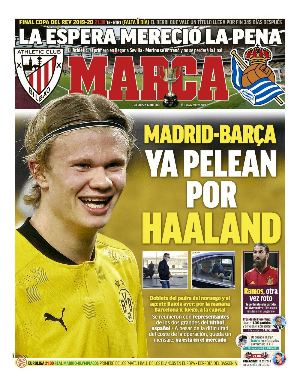 #غلاف MARCA | 🗞- ريال مدريد – برشلونة يقاتلون بالفعل من أجل هالاند.- والد النرويجي ووكيله رايولا أمس صباحاً زارا برشلونة ثم توجها إلى العاصمة التقيا بممثلين من عظماء كرة القدم الإسبانية.- على الرغم من صعوبة تكلفة العملية تبقى رسالة واحدة في السوق- راموس أصيب مرة أخرى سيغيب عن مباراتي ليفربول والكلاسيكو بسبب إصابة في ربلة الساق.