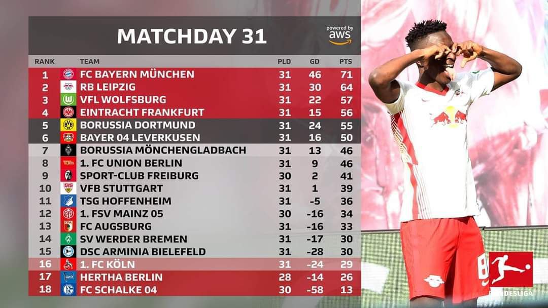 الـدوري الألـمـانــي 🇩🇪 ترتيب الدوري بعد الجولة 31 . ▫️تأجل حسم اللقب الى الجولة القادمة .▪️دورتموند يقلص الفارق مع فرانكفورت و فولفسبورغ و يشعل صراع المراكز المؤهلة لدوري الابطال .6 اندية تصارع على البقاء : ماينز يبتعد قليلا . اوغسبورغ يتقهقر ، بريمن نحو تكرار سيناريو الموسم الماضي ، كولن يواصل الاستفاقة مع فونكل ، هرتا برلين امام روزنامة كثيفة لتدارك المباريات المؤجلة و الإبتعاد من مراكز الهبوط .